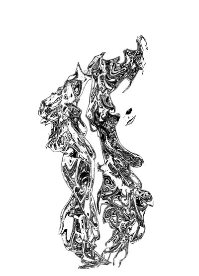 逆方向に回転する一対の火災旋風の写真です。256階調まで色数を減らしてから各色の輪郭を抽出しました。炎の中の宇宙に引き込まれていくように感じます。一つとして同じ炎は無い、という思いを強くしました。